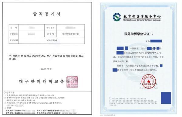 大邱韩医大学录取通知及中留服国外学历学位认证书样本