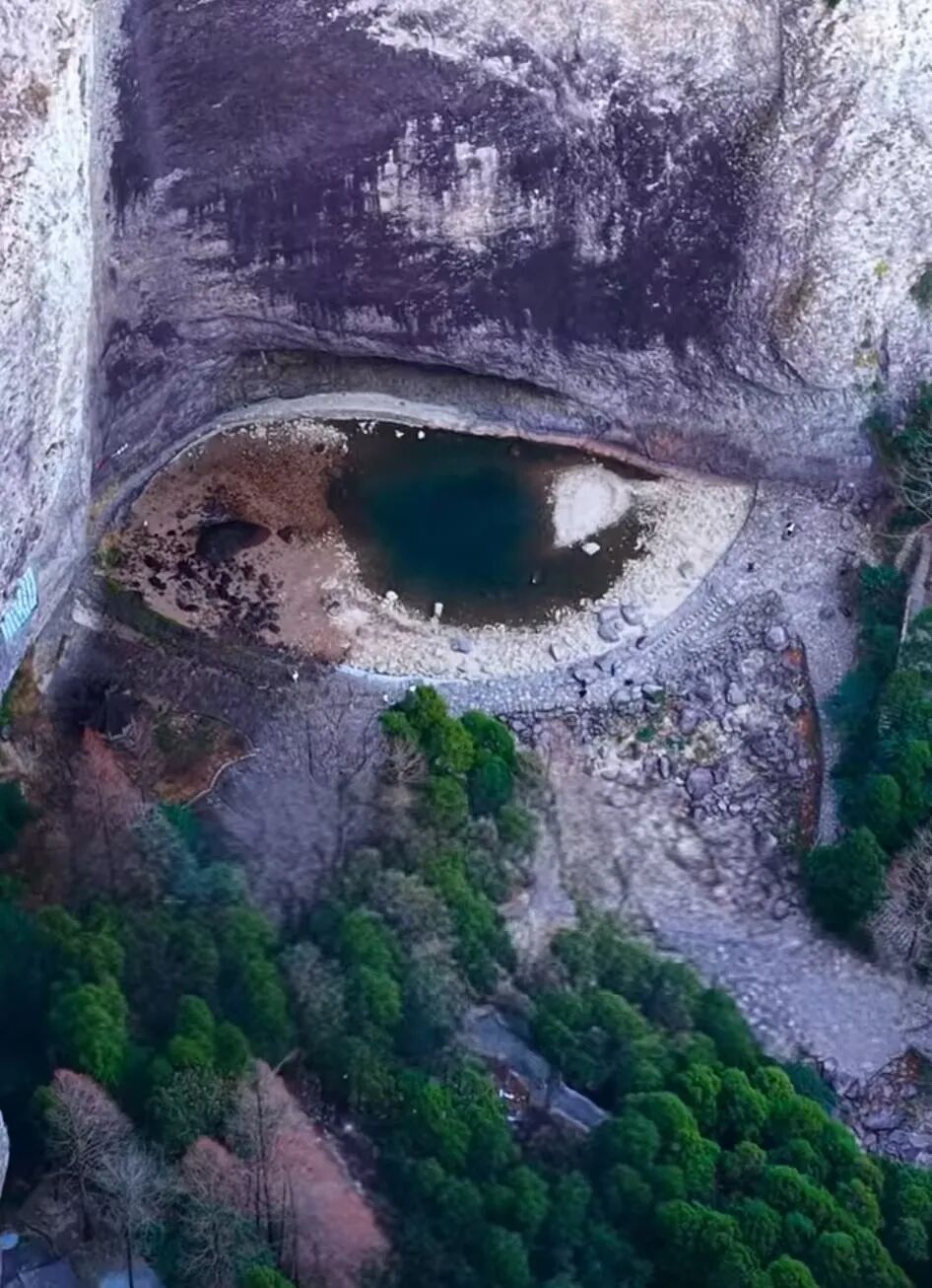 从视频画面可见,这只“龙眼”整体轮廓清晰:潭中央残留的深绿色水域宛如深邃的“瞳孔”,周围浅米色与灰褐色岩壁构成了“眼白”,上方深色岩石凹陷则形似“上眼睑”褶皱。整只“眼睛”镶嵌在灰白色崖壁底部,与下方深绿树林形成鲜明对比,更显生动立体。不少网友调侃称,这还是一只拥有“双眼皮”的龙眼。