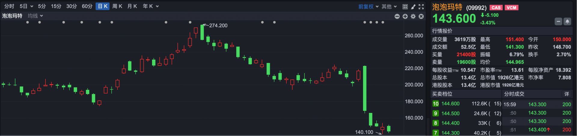 市场焦点方面,新消费概念股走弱,泡泡玛特(HK09992)跌超3%,创下去年4月11日以来收盘新低,其股价自高点“腰斩”。