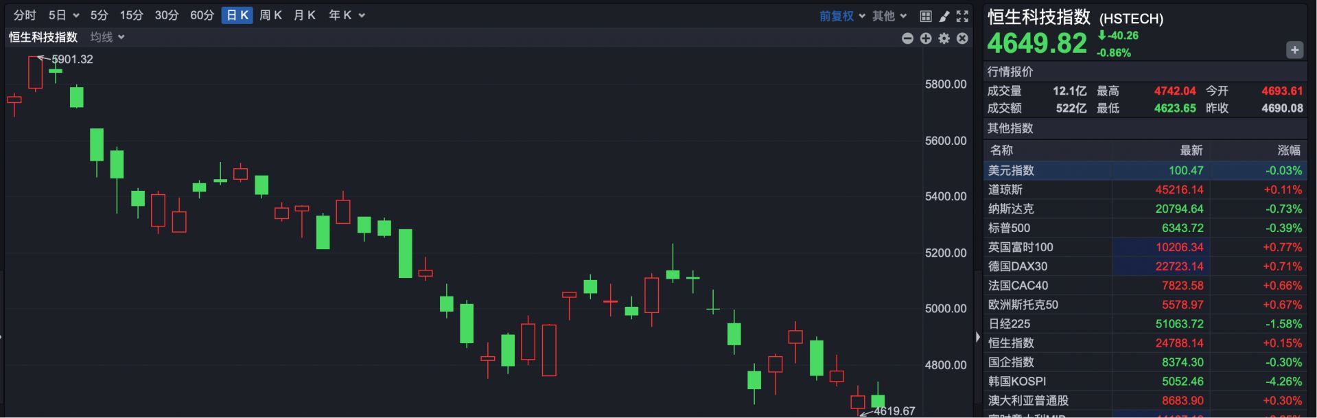 恒生科技指数收盘报4649.82点,下跌40.26点,跌幅0.86%。3月以来,恒生科技指数累计下跌9.50%。